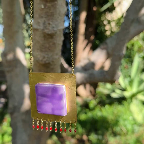 Workmanship and finishing: cut brass, double-sided purple ceramic tile, red micro beads
