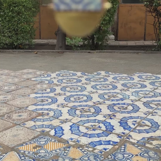 Traitement et finition : impression numérique directe sur kapa, un matériau ultra-léger, rigide et résistant. Chaque carreau est découpé, émaillé et vitrifié à la main. Créoles en laiton découpées et finies à la main.